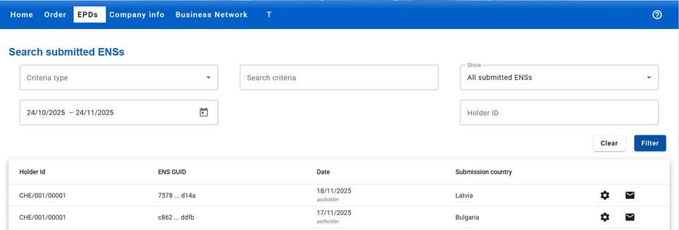 Η εφαρμογή περιλαμβάνει επίσης πλέον μια ειδική ενότητα για την αναζήτηση υποβληθεισών δηλώσεων ENS, διευκολύνοντας τη διαχείριση των υποβολών που δεν σχετίζονται με τις EPD.