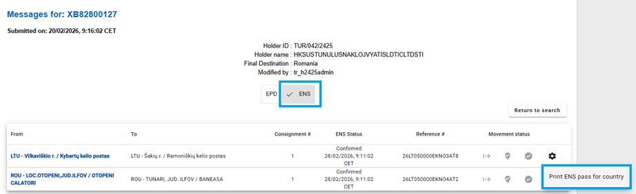 - The ENS Pass can be downloaded directly for the country form ENS messages history → Print ENS pass for country